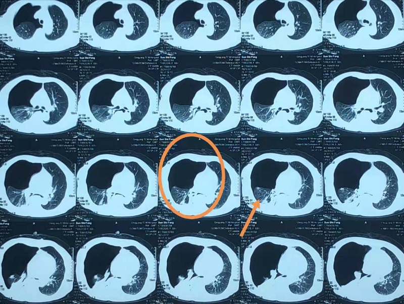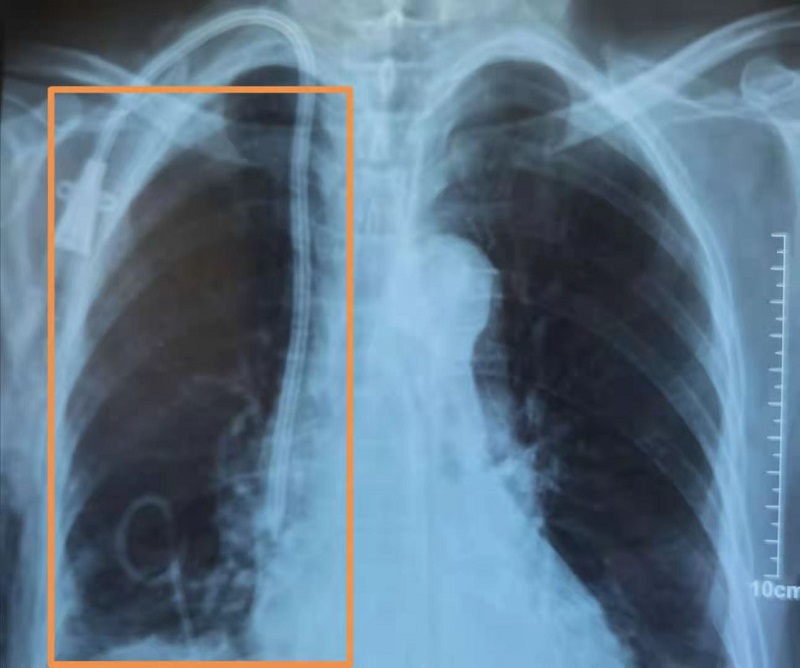患者女性,68岁,患慢性肾衰竭、尿毒症多年,1月26日入住我院肾病科进行维持性血液透析治疗。入院时,胸闷、气短、身体乏力,并伴有咳嗽、咳痰等症状,胸部CT检查提示右侧液气胸,右肺肺不张(外压型)。本着为病人全程负责的理念,肾病科及时邀请外科会诊,外科建议立即请B超室配合行胸腔穿刺闭式引流术,否则患者将会有生命危险。随后,肾病科和B超室协作,紧急为患者进行了B超引导下穿刺引流,手术过程顺利。