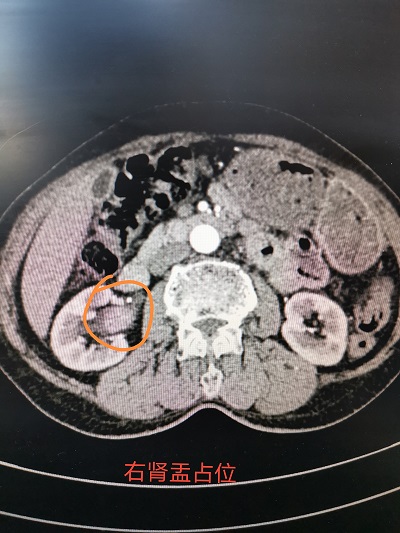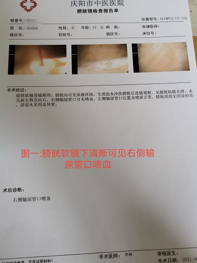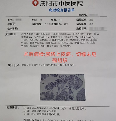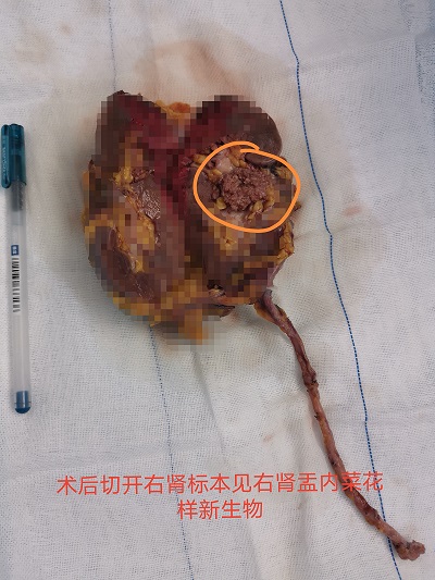 患者女性,74岁,因“间断无痛性肉眼血尿三年”入院,经B超、CT及膀胱镜检查,诊断为右肾盂肿瘤,决定行腹腔镜下肾盂癌根治术。经术前充分准备,在外请专家参与指导下,腹腔镜下行肾盂癌根治术,切除范围包括右侧病变肾脏、右侧输尿管及部分膀胱壁,手术过程顺利,术中出血不多。术后标本病检确定为肾盂尿路上皮癌,目前患者恢复良好。