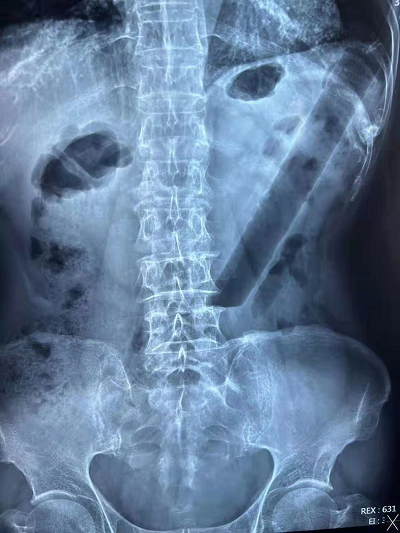 3月19日下午临近下班,肛肠二科门诊赵金龙医生接诊了一名85岁高龄的特殊患者,患者在外院行腹部平片,示结肠异物。经过详细询问病史后得知患者两天前因排便不畅,自行用一根直径约3cm,长约20cm的空心硬塑料管协助通便,结果无法自行取出。随着时间的推移,塑料管的位置也越来越深,患者下腹部也开始胀痛不适,辗转市内其他医院后来到我院肛肠二科门诊就诊。