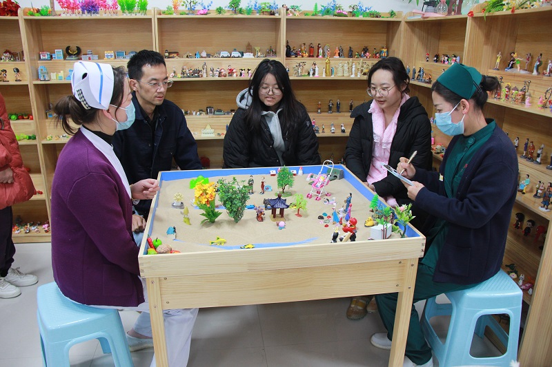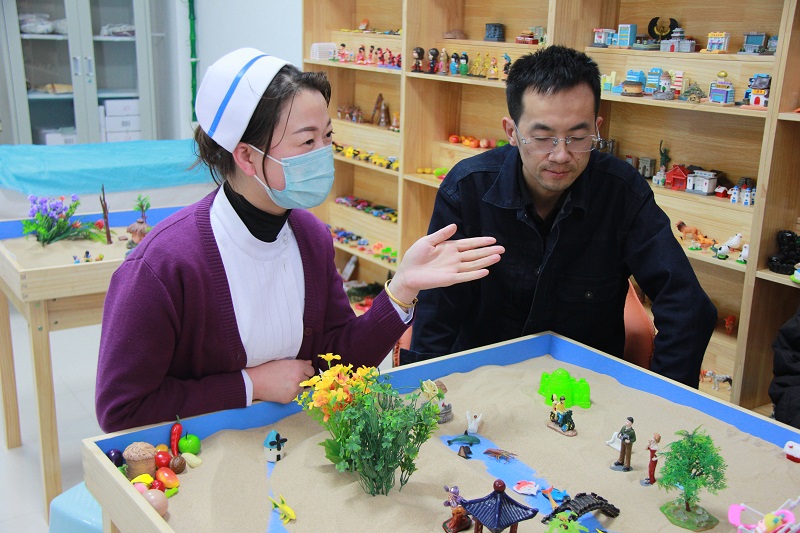 “这不是什么艺术比赛,没关系,可以自由发挥,任意移动沙子,任意摆放沙具,做成你想要的场景,建立一个专属于自己的小世界……”在市中医医院神志病科特色治疗室,一场心理沙盘游戏正在进行,游戏参与者发挥想象力,用一件件生动的微缩模型在沙盘内“描绘”着自己的内心世界,在护士长李亚琴、护士白淑慧的引导下,大家敞开心扉,畅所欲言,诉说着内心的真实想法。