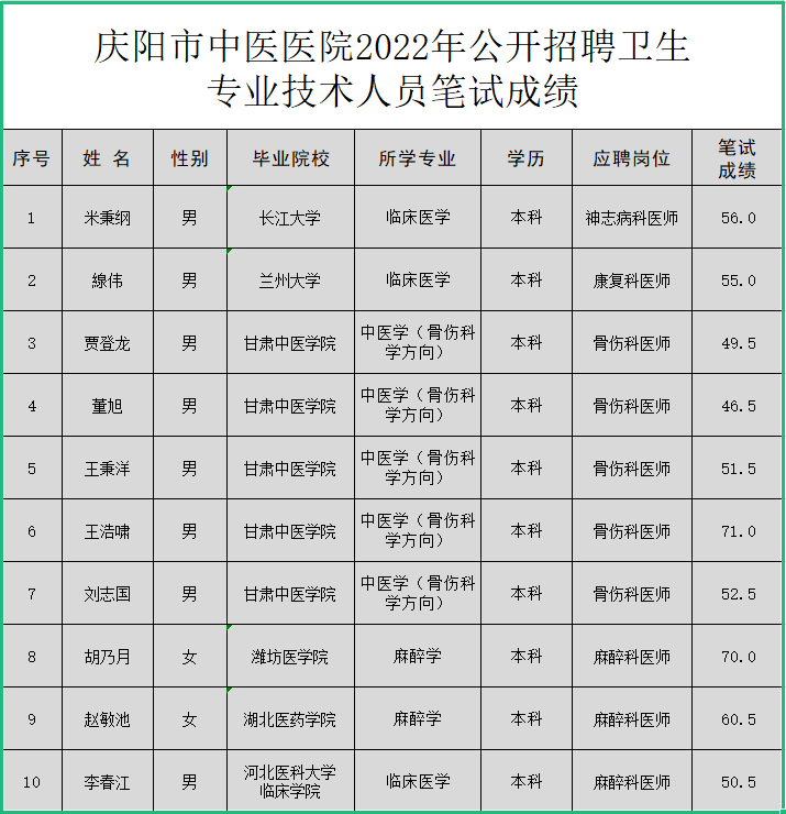 庆阳市中医医院关于公布公开招聘卫生专业技术人员考试笔试成绩的公告