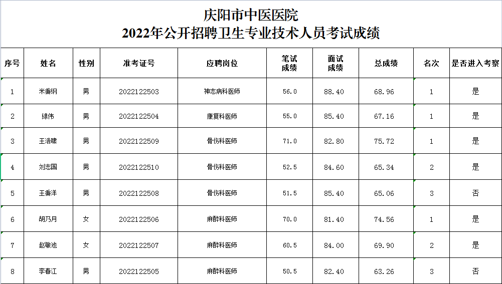 庆阳市中医医院关于公布公开招聘卫生专业技术人员考试成绩的公告