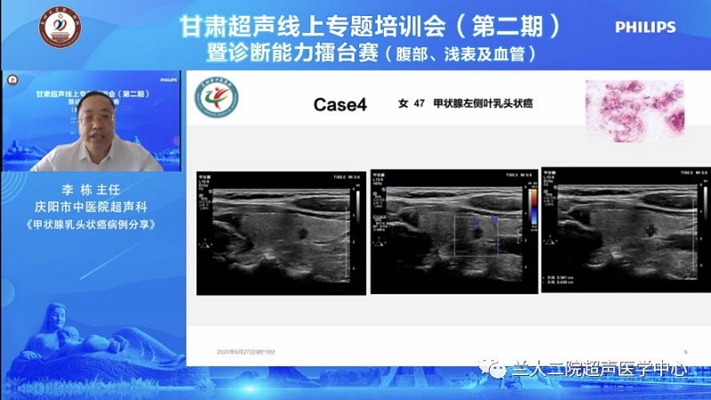 6月27日,由甘肃超声质控中心、甘肃超声质控专科联盟、甘肃医师协会超声医师分会主办,兰大二院超声医学中心承办的甘肃超声线上专题培训会(第二期)暨诊断能力擂台赛成功举办。本次线上专题培训会主题为“腹部、浅表及血管”,内容包括疑难病例解析讲座、操作规范演示、报告规范解读、超声诊断能力擂台赛。我院功能科副主任李栋受大会邀请,做了题为“甲状腺乳头状癌”的病例解析。