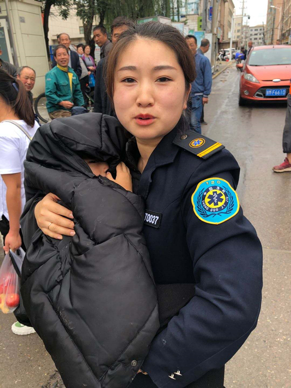 7月25日下午,市中医医院救护车转运病人返院途中,在大什字附近发现一名3岁左右的小女孩跌倒在水坑中,司机肖桐林随即停车,急诊科医生杜赵博、护士石宇佼立刻下车查看询问。女孩身边并没有家人跟随,哭闹不止,石宇佼抱住小女孩一边安慰,一边疏散人群,并让路人帮忙拨打110报警求助。110民警赶到现场后,石宇佼跟随民警将小女孩送至派出所,待女孩父母赶到后才离开。29日,女孩父母专程到医院送锦旗并当面道谢。