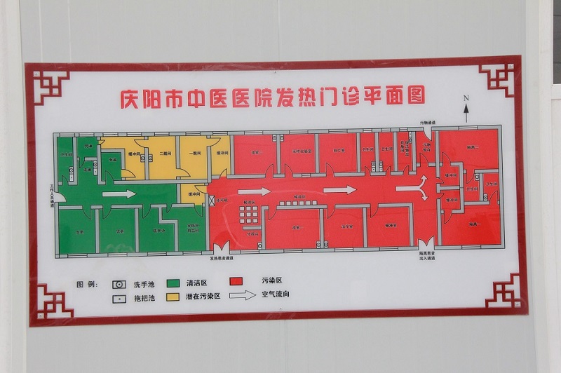 新建预检分诊和发热门诊位于医院入口西侧,总占地面积258.22平方米。预检分诊区分了职工与患者通道,职工持工作牌可直接入院,患者及家属则全部进入预检分诊处进行扫码登记、测量体温、询问旅居史。发热门诊规范设置三区四通道布局,分污染区、潜在污染区和清洁区,各分区之间有物理隔断,设置患者通道和医护通道,医患及污物完全分离,避免交叉感染。共配备2间诊室、2间隔离病房和采样化验室、治疗室、输液室以及其他配套辅助用房。