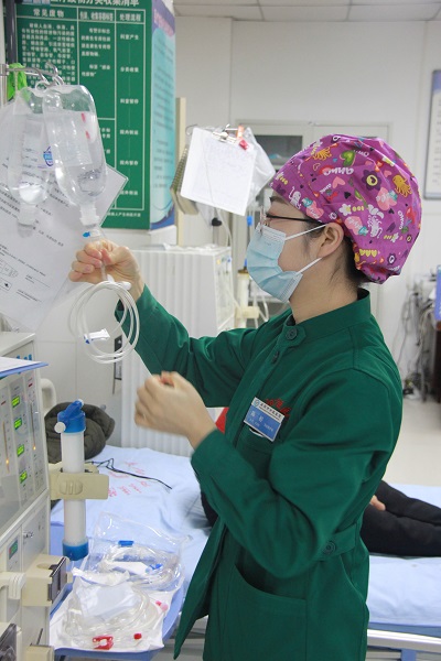 开机、预冲、穿刺、引血、上机、下机、终末处理……透析工作单调、重复,但是,工作人员日复一日,年复一年,每天热情地接待前来透析的每一位患者。“给予病人温暖,给予病人第二个家”是我时常挂在嘴边的一句话。我也将带领血液净化中心全体工作人员践行好这句话,以患者为中心,不断提升治疗水平和服务质量,帮助他们延续生命、提高生活质量,健康回归社会。