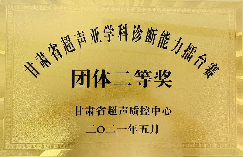 5月9日,在“甘肃超声骨干医师培训暨超声质控研讨会”上,进行了甘肃超声诊断能力擂台赛、超声新技术病例大赛及优秀超声质控中心颁奖,我院超声团队荣获超声亚学科诊断能力擂台赛团体二等奖。