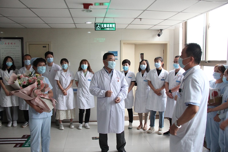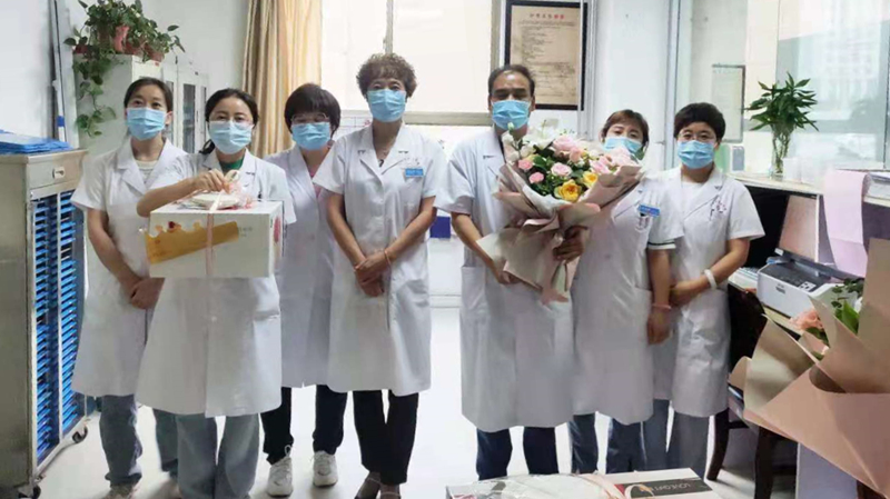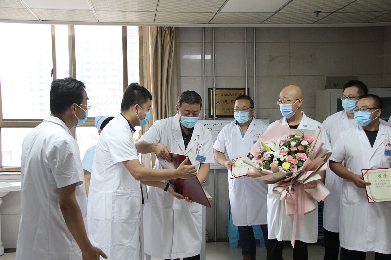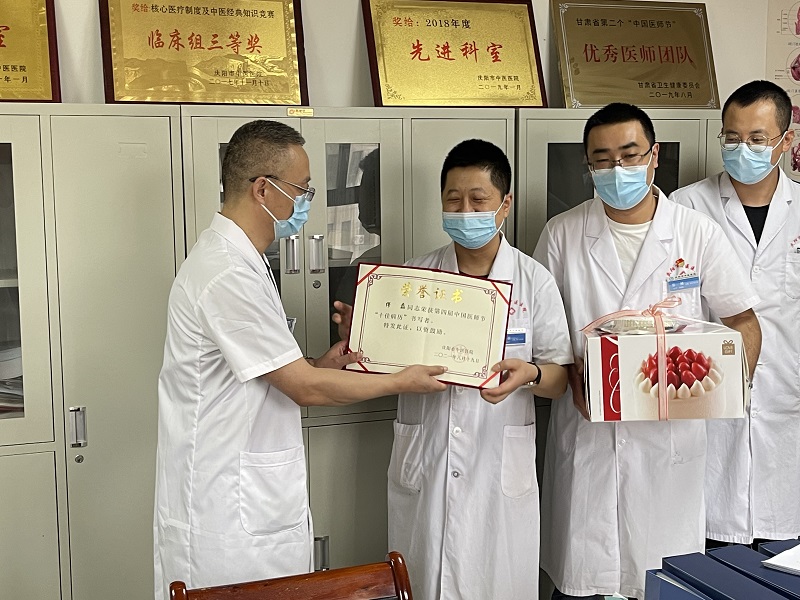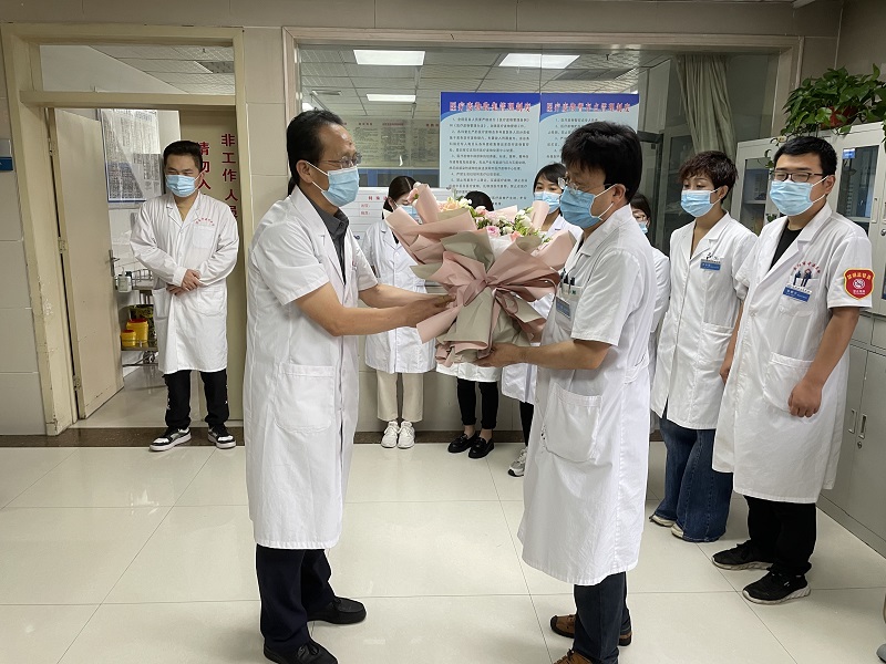 在康复中心,院党委书记闫庆荣祝福科室全体医师节日快乐,并指出,当前疫情防控形势依然严峻,希望大家能继续坚守,认真工作,为人民群众的健康保驾护航。在脾胃肝胆病科,院长袁岳鹏为张惠珍医师送上“大医精诚”奖杯,感谢她多年来为医院发展和人民群众生命健康付出的不懈努力,同时向科室全体医师们表示衷心的感谢和节日的祝福。