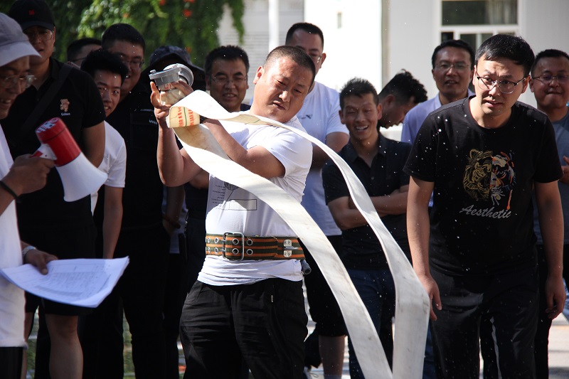 副院长朱明霞宣读比赛规则并宣布比赛开始。各科室推选出的64名选手两两组队参赛,开始计时后,一名选手负责抛开铺平水带并接好枪头奔向模拟起火点,另一名选手则将水带接入消火栓,并使用扳手打开水源阀门,待队友向模拟起火点喷水成功“灭火”后,关闭阀门,两名选手再配合收卷好水带。比赛邀请消防维保公司的专业人员担任评委,按照操作规范程度和用时长短两个指标进行打分排名。