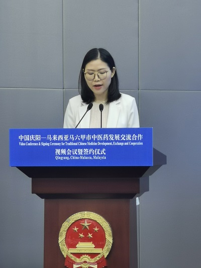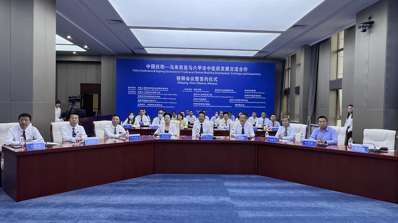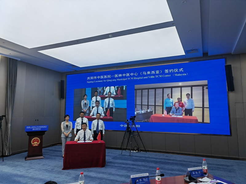 7月16日,由庆阳市政协牵头,庆阳市政府外事办、甘肃驻马来西亚商务代表处、马来西亚医林中医中心、马来西亚中国商业交流协会主办的中国庆阳—马来西亚马六甲市中医药发展交流合作视频会议暨签约仪式在庆阳市数字政府运营指挥中心、马来西亚马六甲市国际郑和研究院举行,庆阳市政协主席李隆基、马来西亚马六甲州对华特使颜天禄出席会议并致辞。市中医医院党委书记、院长袁岳鹏代表医院与马来西亚医林中医中心签订中医药交流合作框架协议,副院长白杨在会上作交流发言。