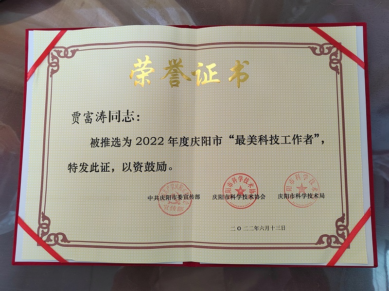 2022年庆阳市“最美科技工作者”推荐活动由中共庆阳市委宣传部、庆阳市科学技术协会、庆阳市科学技术局联合主办,经由各县(区)、市直有关单位、市级学(协)会自下而上、择优推荐,全市共推荐38名科技工作者作为候选人,最终评选10名政治过硬、业绩突出、事迹感人的科技工作者授予2022年度庆阳市“最美科技工作者”称号。经庆阳市药学学会推荐、医院审核,我院药剂科制剂室负责人贾富涛被推选2022年度庆阳市“最美科技工作者”。