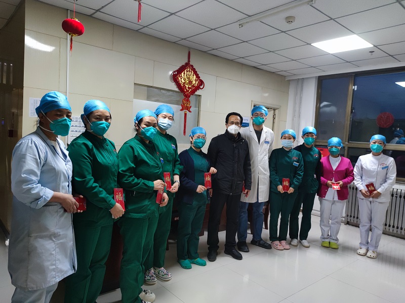 晚上六点,院班子成员又分组带领相关科室工作人员,深入医院各科室、各岗位,看望慰问除夕夜仍然坚守的职工,为他们送上代表新春祝福的红包,感谢他们今夜的坚守,希望他们站好最后一班岗,也过一个愉快祥和的春节。