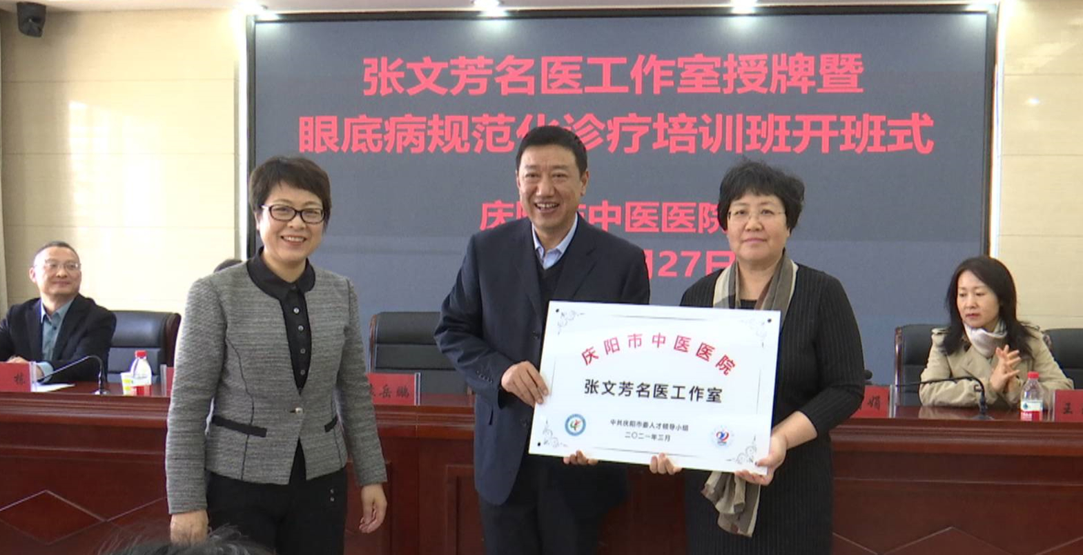 - 3月27日上午,兰大二院眼科专家张文芳名医工作室在庆阳市中医医院正式挂牌,并举行了陇东地区眼底病规范化诊疗培训班。 在授牌仪式上,市卫健委党组书记、主任邓莉娟致辞并为张