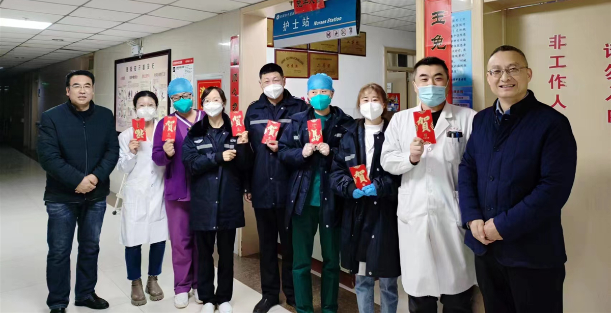 - 今天是农历大年三十,院班子成员看望慰问了一线值班值守人员,为他们送上水果、红包和新春的祝福。 上午八点半,住院部一楼大厅格外热闹,值班值守的医护人员推着小推车在这里