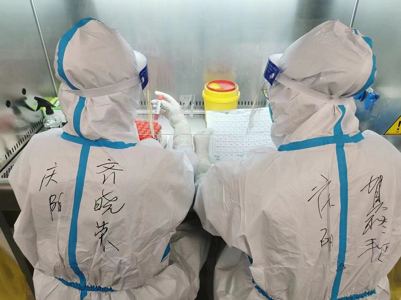我们医院支援了5台核酸提取仪和12台核酸扩增仪,我主动承担起了仪器的调试与操作工作,并给大家介绍仪器的操作步骤。由于我们核酸检测队伍只有四名男同志,我和其余三名男同志主动承担搬运仪器、试剂等工作。每个班次检测的标本量都在一万管以上,负责加样本的齐晓荣要把每一管标本准确无误加到一个个96孔板里面,每个班次下来都是腰酸背痛、手指抽筋。