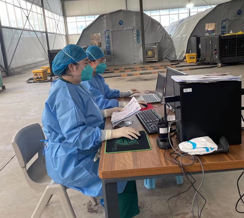王翔雲负责检测信息的上传工作,每隔一小时王翔雲就要统计气膜舱的检测进度,对“已上机”和“已下机”的标本信息分类统计,阴性结果及时上传,阳性结果汇总上报。每个班次上万管的标本信息都要一个一个核对、统计和上报。由于信息上报是最后一个步骤,每次都是等待检测人员完成所有的标本,上传完所有的信息之后,王翔雲才能拖着疲惫的身躯离开工作岗位。